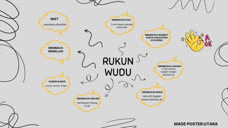 hello, I made a mind mappng poster about the pillars of wudu and the procedures for wudu so that you don’t make mistakes, for example the intention, reciting bismillah, gargling the mouth, etc. These pillars of wudu are for the diniyah project and with the correct procedures with graffiti decorations and there is a poster maker and there are also a few decorations